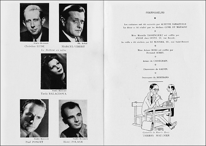int. : Daniel Ceccaldi, François Chaumette, Wiliam Sabatier, Georges Arluc, Robert Frantz, Roger Pigault, mise en scène : Albert Medina, musique : Louis Bessieres, masques : Paul Grimault, Félix Labisse, Maurice Henry, Brassaï